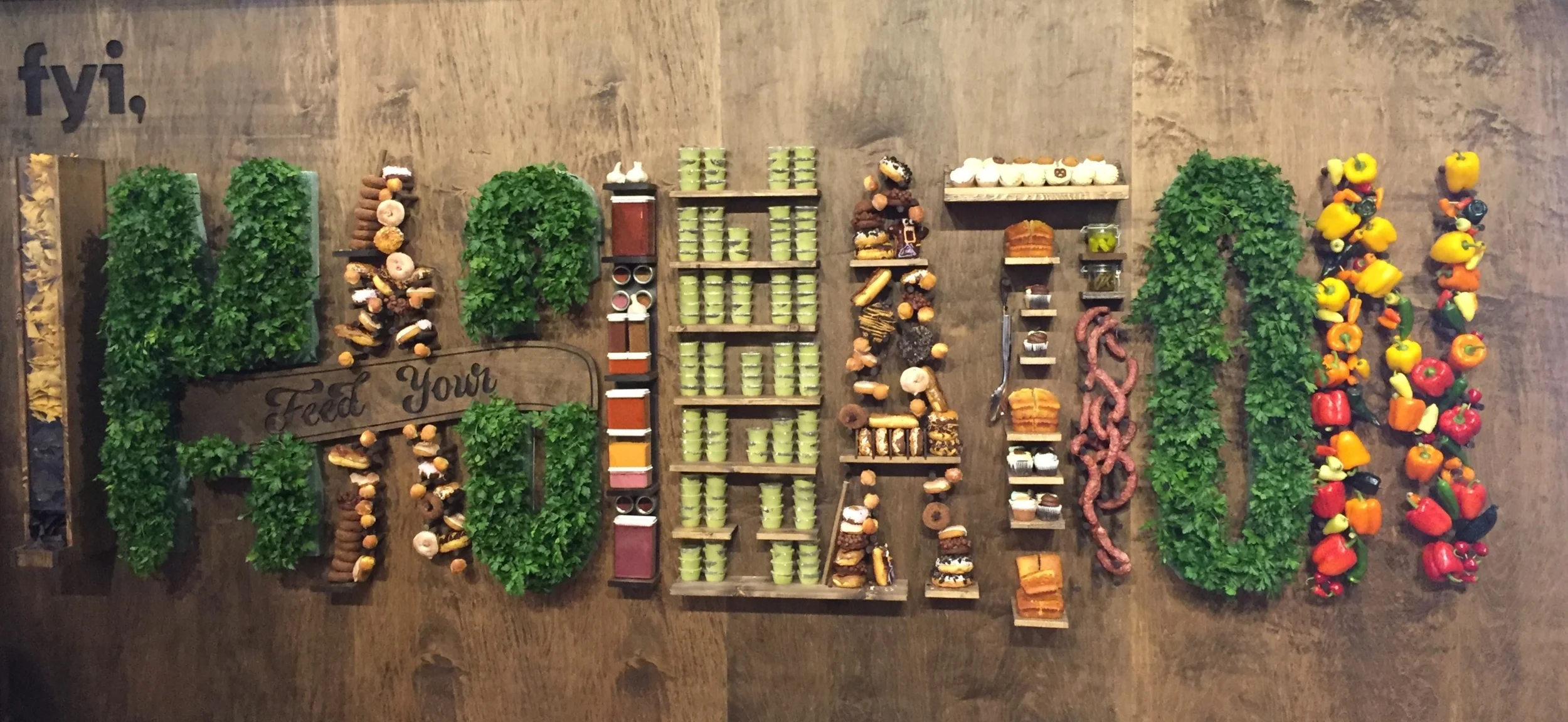 Civic Entertainment enlisted our fabrication help at SXSW 2016 to create the "Bite Club" for the FYI channel. Elements included custom bar and back bar where latte portraits were made for guests. Chalkboard graphics, wall coverings, and custom shelving were just a few of the pieces we crafted to give the room its atmosphere. The highlight of the Bite Club was a giant wall we made that spelled out "Imagination". Food typography artist Danielle Evans designed and filled the wall with food for guests to enjoy.